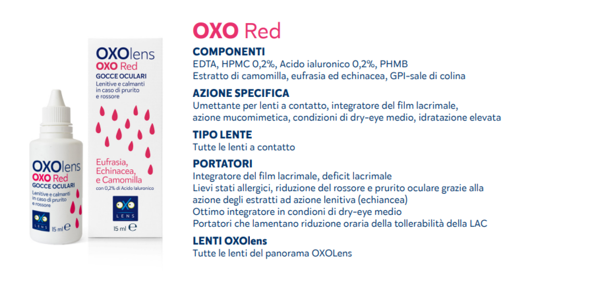 COMPONENTI EDTA, HPMC 0,2%, Acido ialuronico 0,2%,PHMB Estratto di camomilla, eufrasia ed echinacea, GPI-sale di colina AZIONE SPECIFICA Umettante per lenti a contatto, integratore del film lacrimale, azione mucomimetica, condizioni di dry-eye medio, idratazione elevata TIPO LENTE Tutte le lenti a contatto PORTATORI Integratore del film lacrimale, deficit lacrimale Lievi stati allergici, riduzione del rossore e prurito oculare grazie alla azione degli estratti ad azione lenitiva (echiancea) Ottimo integratore in condioni di dry-eye medio Portatori che lamentano riduzione oraria della tollerabilità della LAC LENTI OXOlens Tutte le lenti del panorama OXOLens